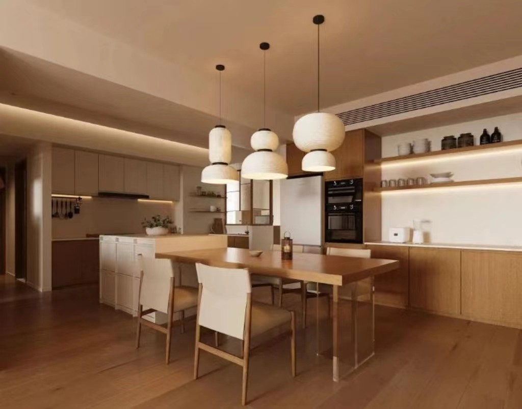 原木色为主调,将阳台融入客厅,创造出宽敞明亮的空间,同时采用开放式厨房和岛台设计,提升了空间的利用率和视觉效果。