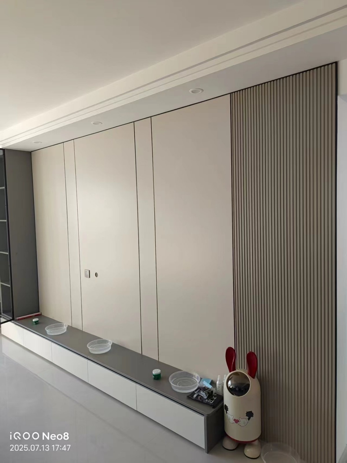 吊顶是简单的三眼皮吊顶,做了L型电视柜,简单大气