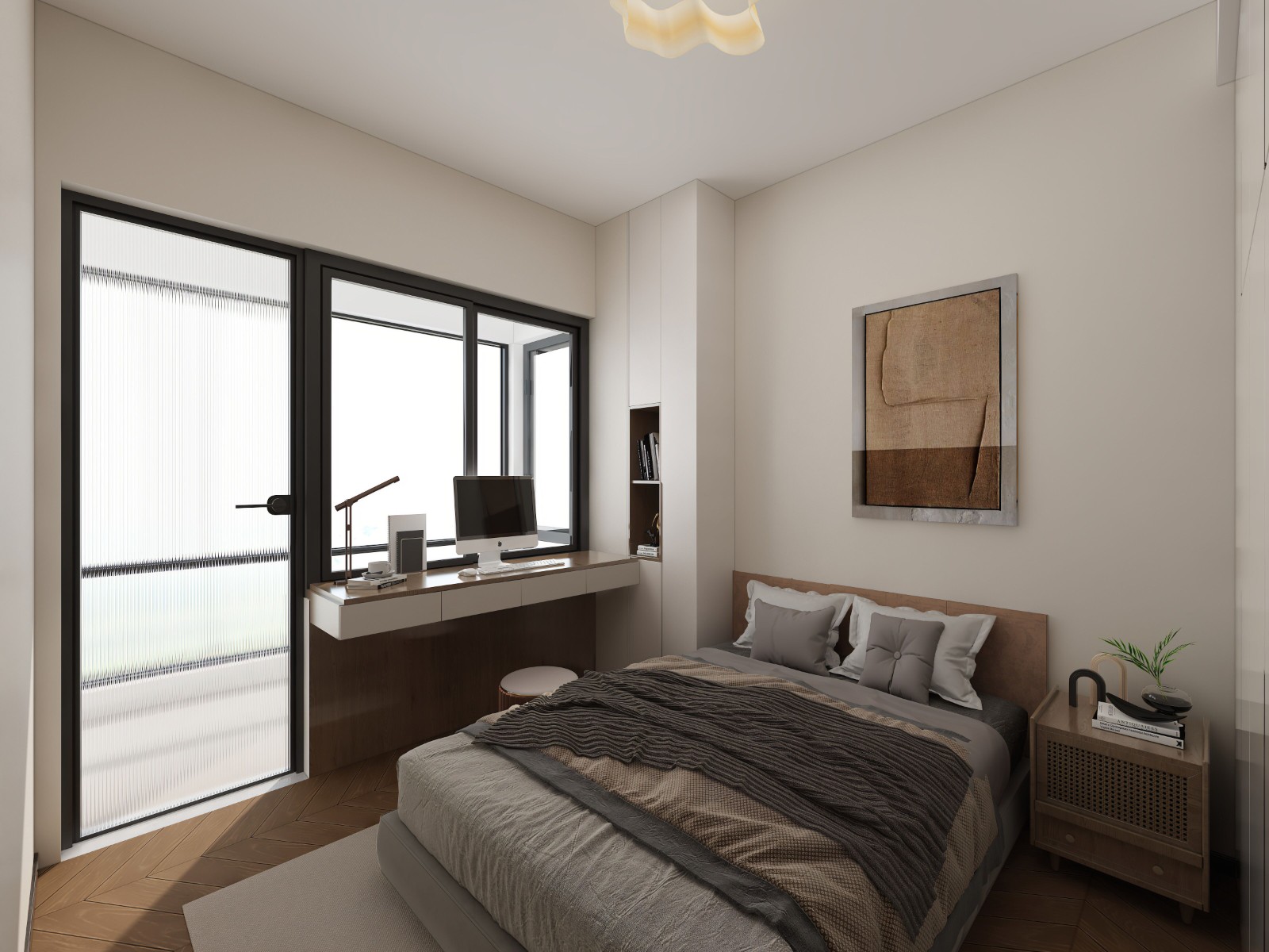集睡眠与办公于一体,大窗(带玻璃门)保障采光,窗边定制书桌满足学习工作;灰棕床品简约沉稳,小细节(床头柜、装饰画)让空间更具生活感。