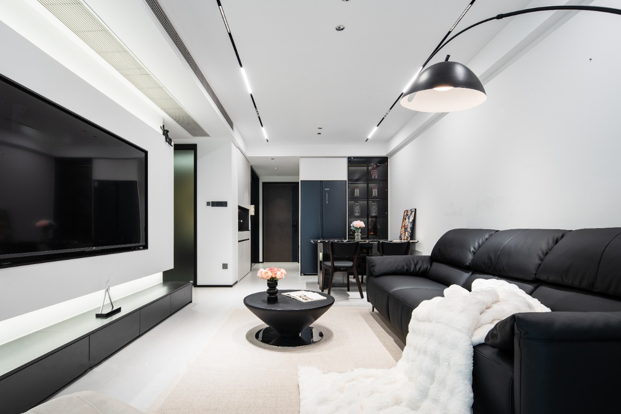 入户即见简净的黑白搭配而出的空间主体框架,在无主灯设计加持之下,全屋呈现出了利落、通透、明朗的格调。