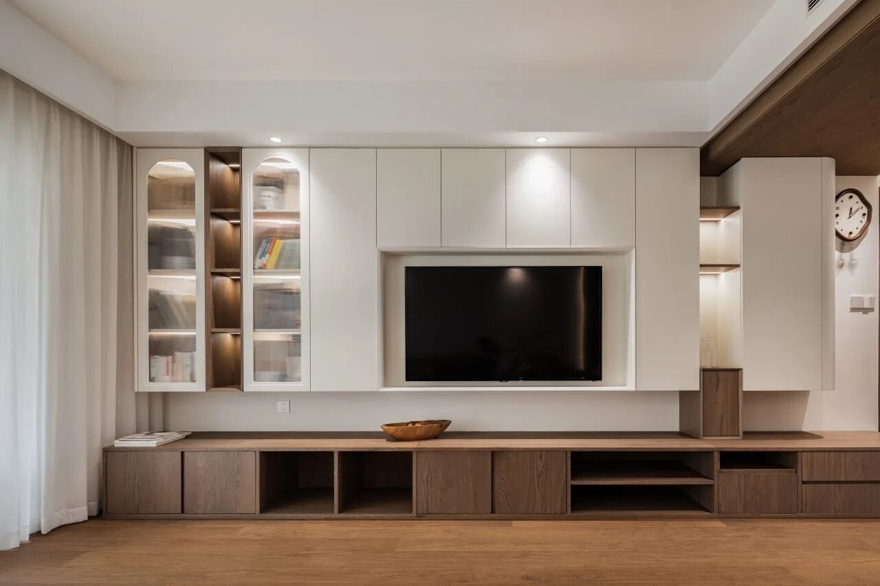 本案最出圈的设计点在于全屋的定制柜,光对图纸就对了4遍,每一个设计细节许工都亲自拿捏。嵌入式电视机背景柜,定制一体式超长版电视机柜,每一项都很加分。
