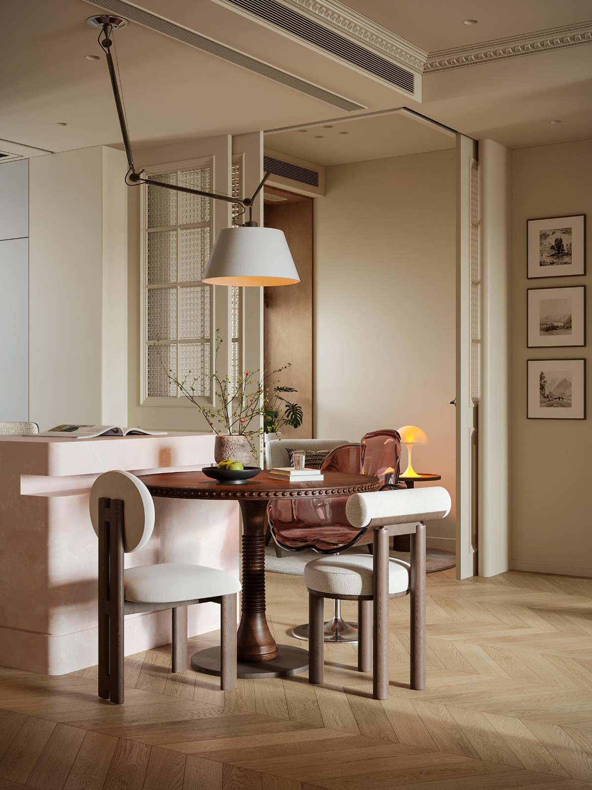 基于将北卧空间打通为思路,改变家里的活动动线,有考虑独立玄关的,也有岛台嵌圆桌的形式,有将两个朝南卧室都做局部改造的,也有不动的,每稿方案倾向功能都不一样,所以需要和屋主见面沟通,根据他们的实际情况做决策。