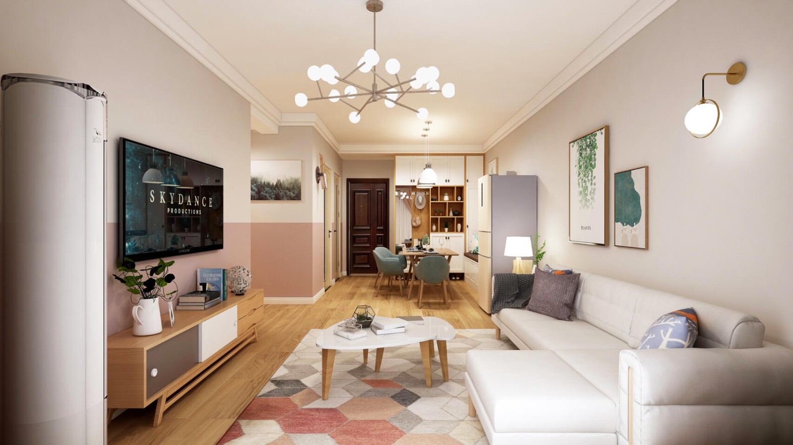 客厅和餐厅空间相互借用,整体面积使用率高,卧室空间方正,便于布局,双卧室南面开窗,采光通风优良