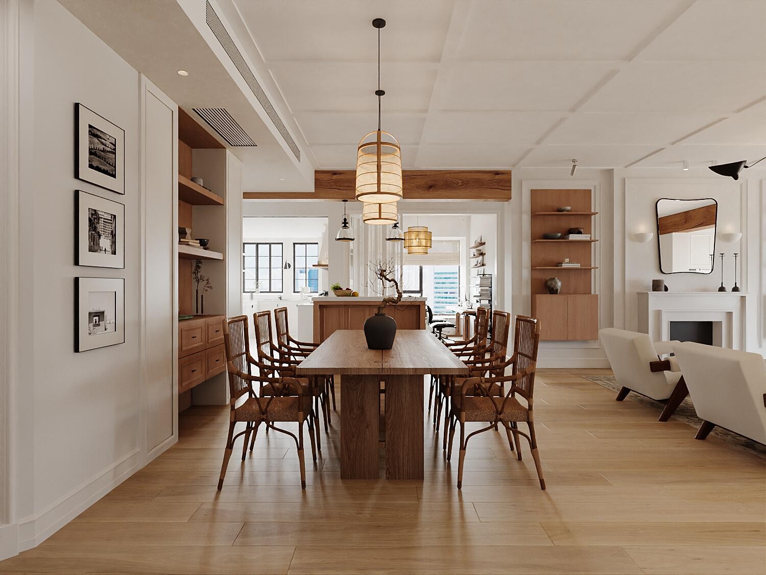 木梁+全屋木地板+棉麻质感家具 配色:白色+原木色+少量黑色 通风和采光***原则 无吊顶+***空高