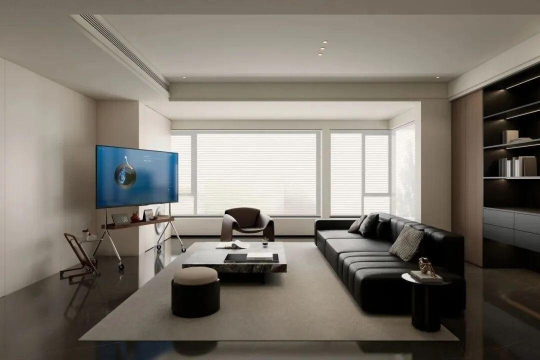 以简洁线条和柔和色调营造舒适大气氛围。黑色皮质沙发搭配抱枕,茶几、椅子实用且具设计感。可移动电视带科技感,大窗户配百叶窗调节光线。右侧柜体兼具收纳与装饰,光滑地面提升空间通透感,整体功能与美观兼具。