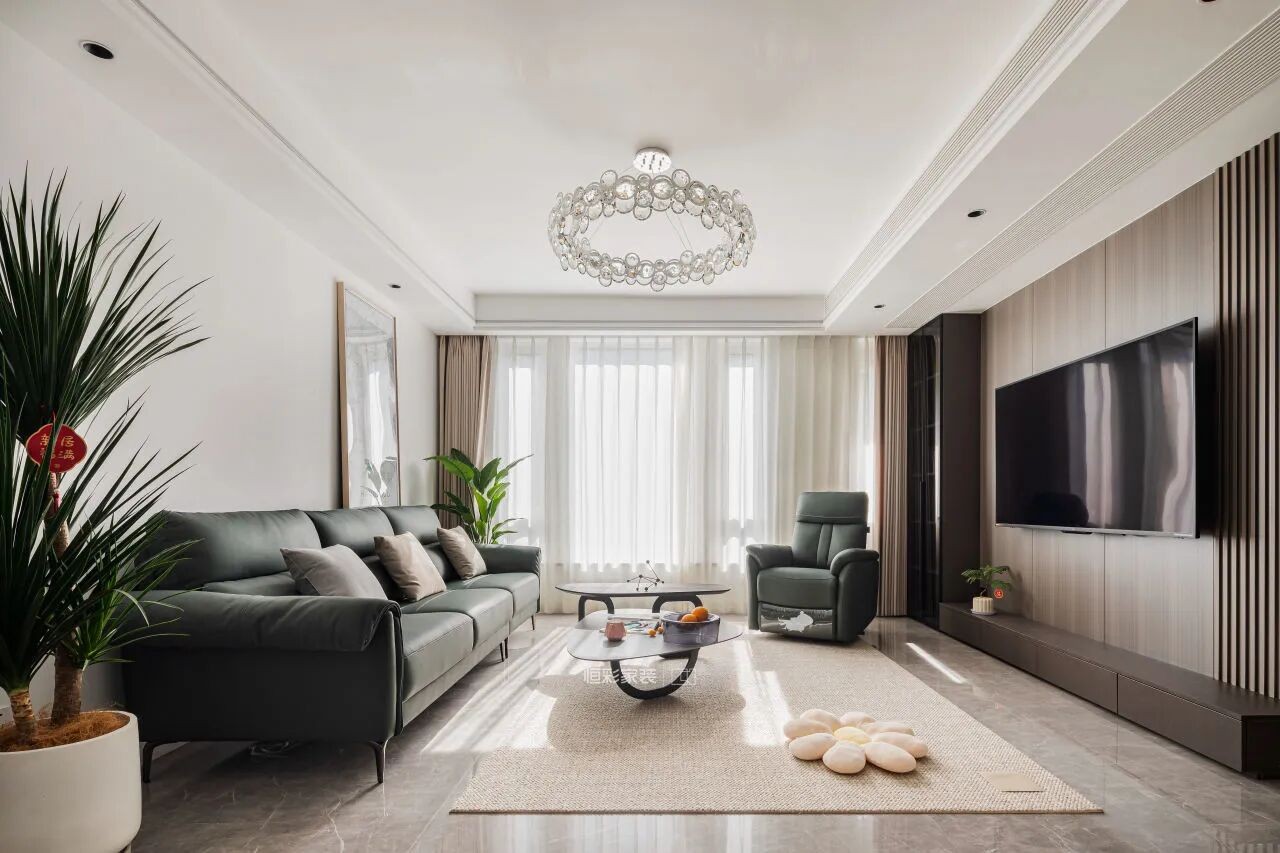 一楼客厅作为会客区,主打一个简约大气。大理石纹地砖通铺,搭配简约干净的水晶吊灯,整面落地窗采光佳,空间清爽大气。