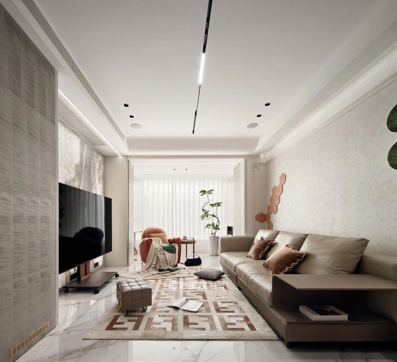 客厅做了无主灯的设计,金属轨道灯搭配筒灯、灯带、射灯的综合光源设计,视觉上简化了空间,弱化复杂的装饰,强化了材质的质感。