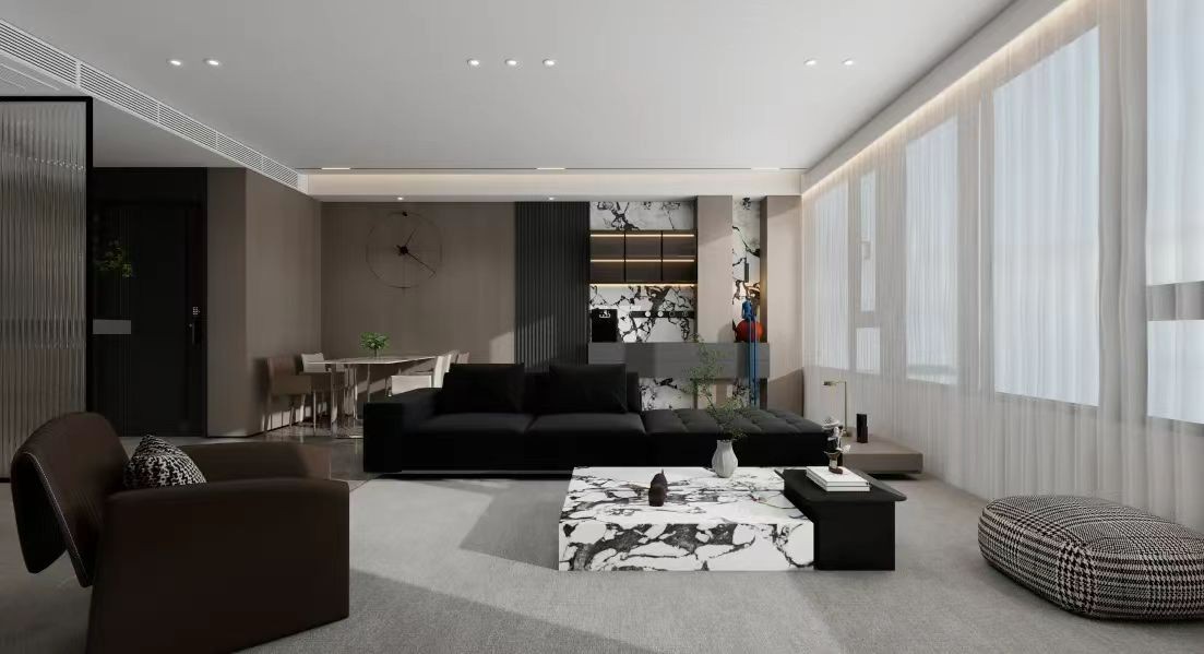 深灰地砖铺陈,意式极简客厅沉稳干练