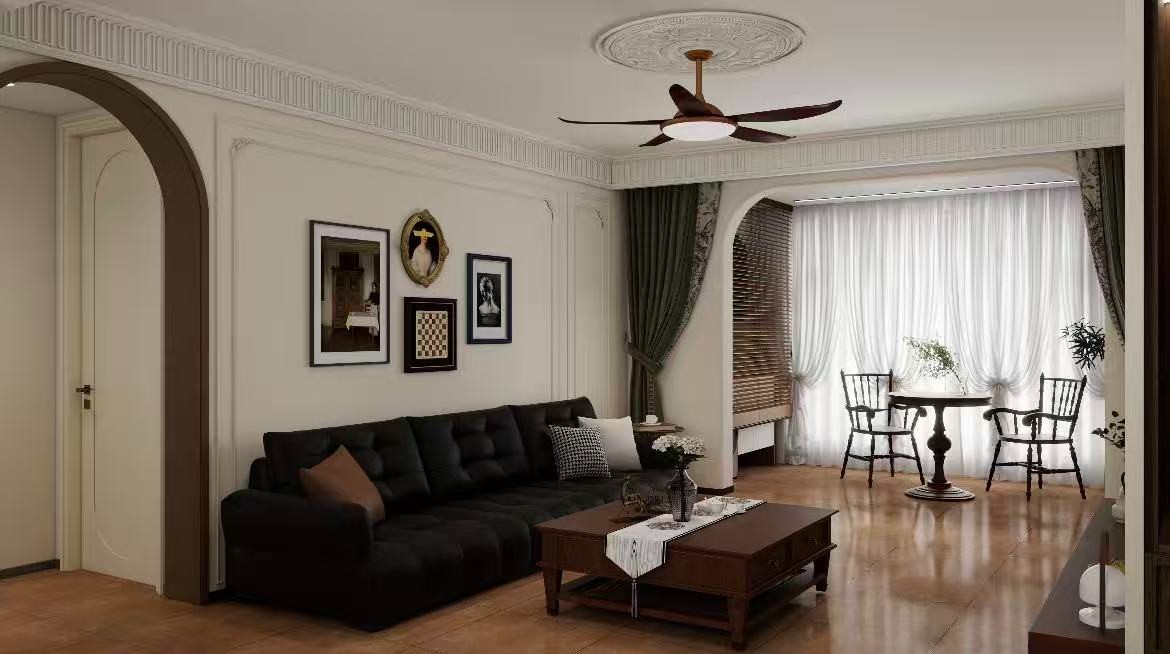 复古轻法式风格客厅:墙面做石膏线装饰,搭配拱形门洞;黑色皮质沙发+木质茶几,角落设小餐桌,深绿窗帘与装饰画增强复古氛围,吊顶风扇灯兼顾实用与风格。