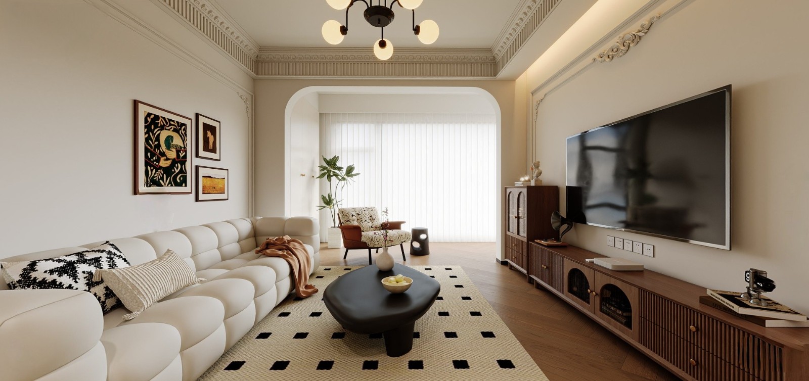当推开门的那一刻,时光仿佛慢了下来。胡桃木的温润、奶油色的柔和、藤编的质朴,共同勾勒出一个超越时间的家。