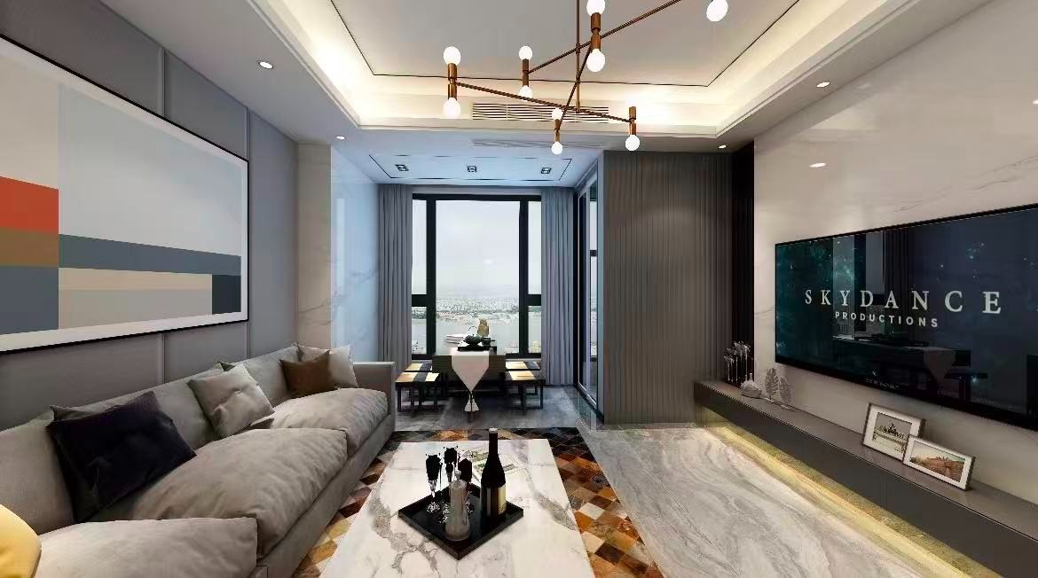整体以灰色、白色为主色调,搭配金属元素,营造出简约***的氛围。左侧是灰色的大户型沙发,搭配多色抱枕,舒适且具设计感;中间是大理石纹理的茶几,摆放着酒具与酒瓶,增添生活气息。右侧墙面嵌入大屏电视,下方是灰色收纳台,摆放着装饰画与摆件。顶部的金属线条吊灯设计独特,结合嵌入式灯光,提升了空间的层次感。远处的餐厅与大窗户相连,窗外可俯瞰城市景观,让空间更显通透。