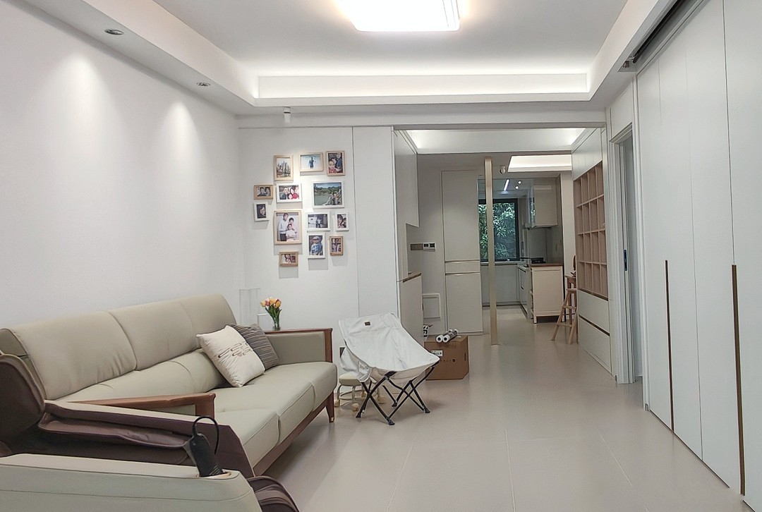 一家三口,三人沙发完全够坐的,旁边放一个按摩椅,在按摩椅上面可以缓解***的疲劳。整个空间以白色为主,简单好看。白色看着比较放松,而且搭配暖暖的柔光灯,会显得温馨,中间做一个大灯,四周搭配小射灯,采光非常充足,可以满足不同场景下的灯光需求。