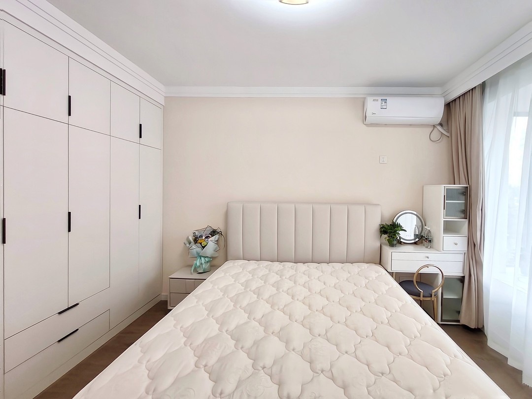 主卧的活动区域很大,没有做太多的橱柜,床的尾部还剩很多空间,可以做一排定制橱柜,收纳和储物空间更大,客户想要灵活一些设计的是后期做投影墙,所以没有做橱柜。也可以做橱柜和升降投影布,但是空间稍显拥挤,幕布离得太近了