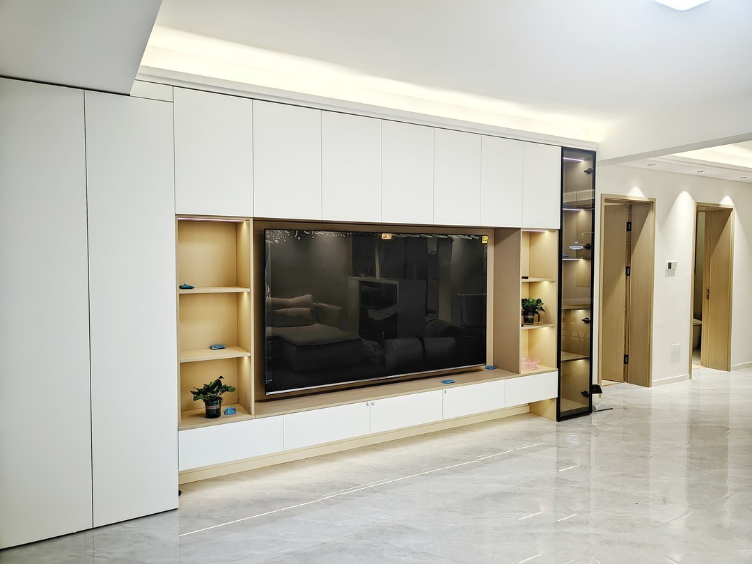 客厅开间还是很大的,很宽敞,电视柜做的是整墙设计,