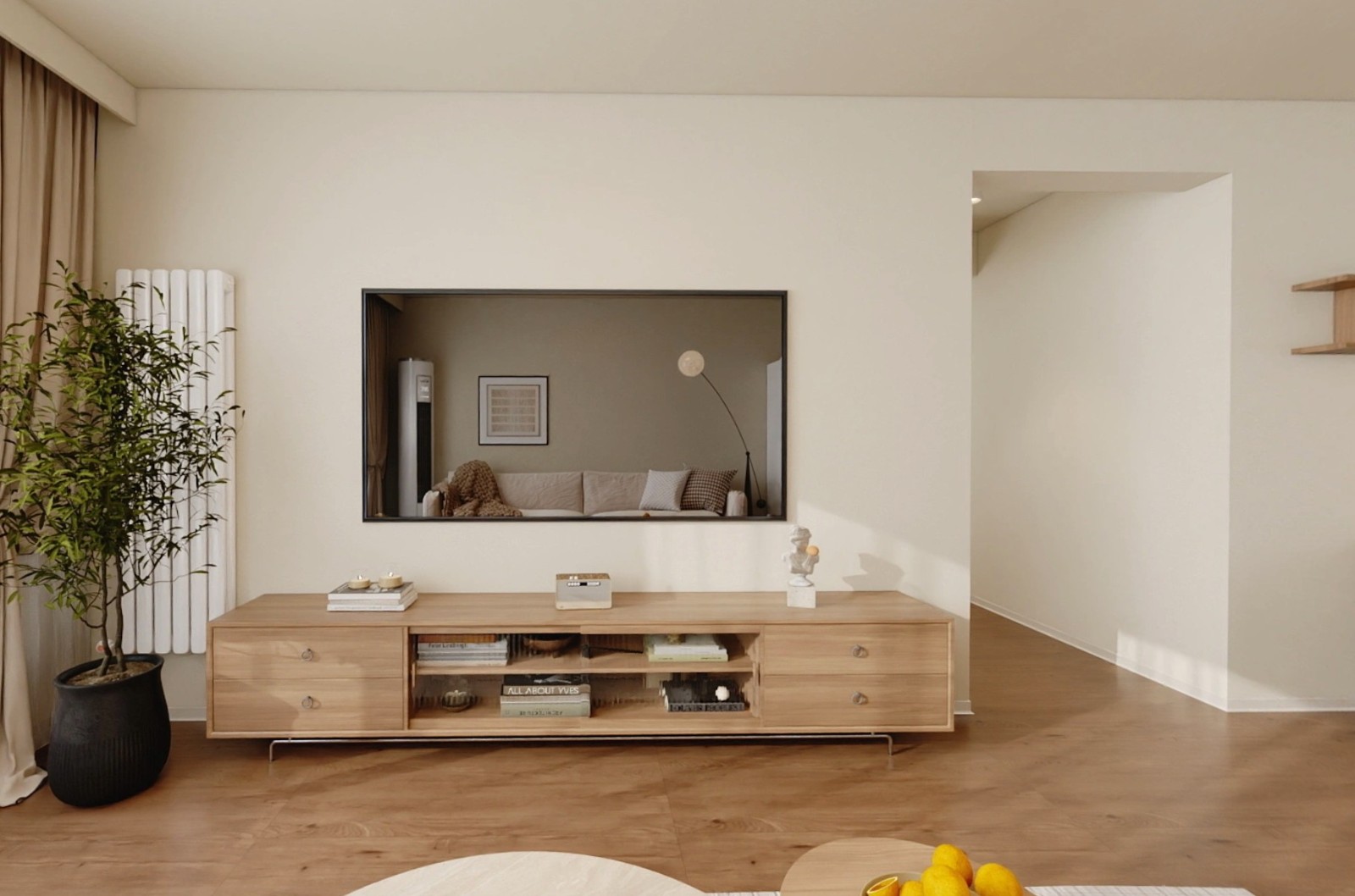 北欧风格,木色地砖,木色电视柜,加绿植