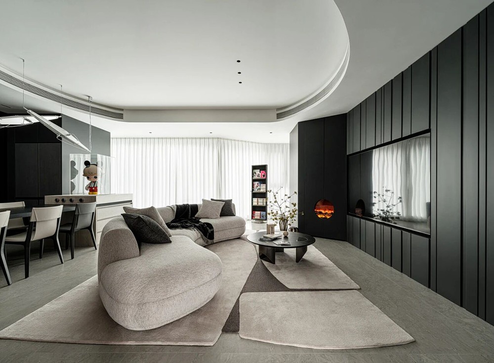 嵌入式壁炉为空间带来温馨感,黑色圆形框架内的跃动火焰,以一抹温暖的橘色打破了深色背景的冰冷感。