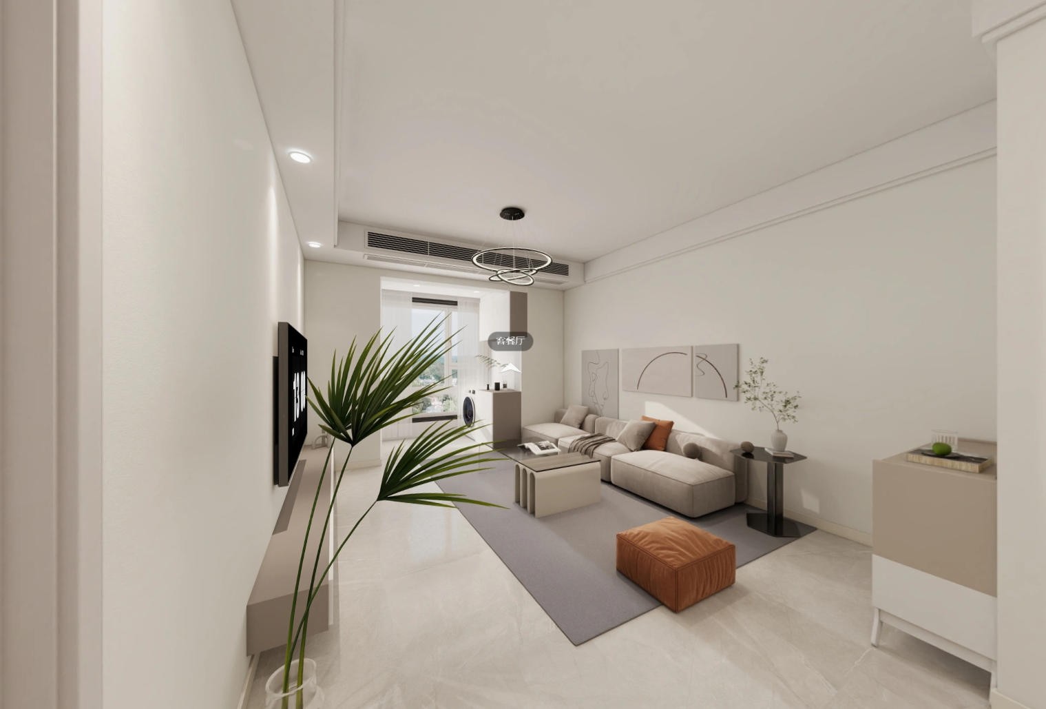 客厅为现代简约风格,浅色系沙发搭配简约茶几,布局通透开阔。墙面装饰画与绿植点缀,丰富空间层次;