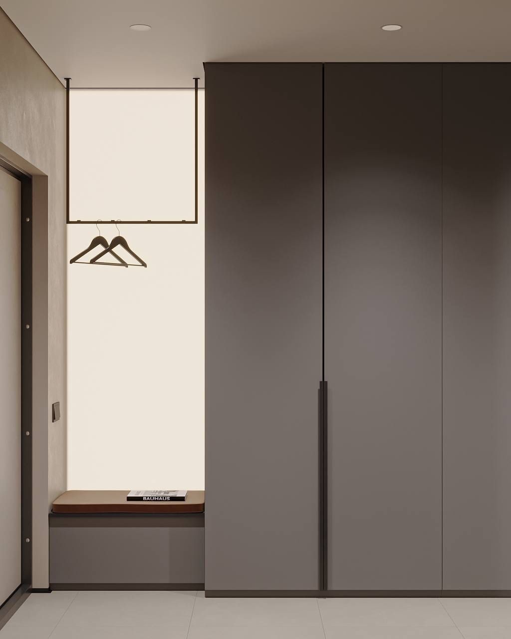 玄关衣柜线条简洁颜色选用灰色和咖色搭配衣柜背板亮显增加仪式感