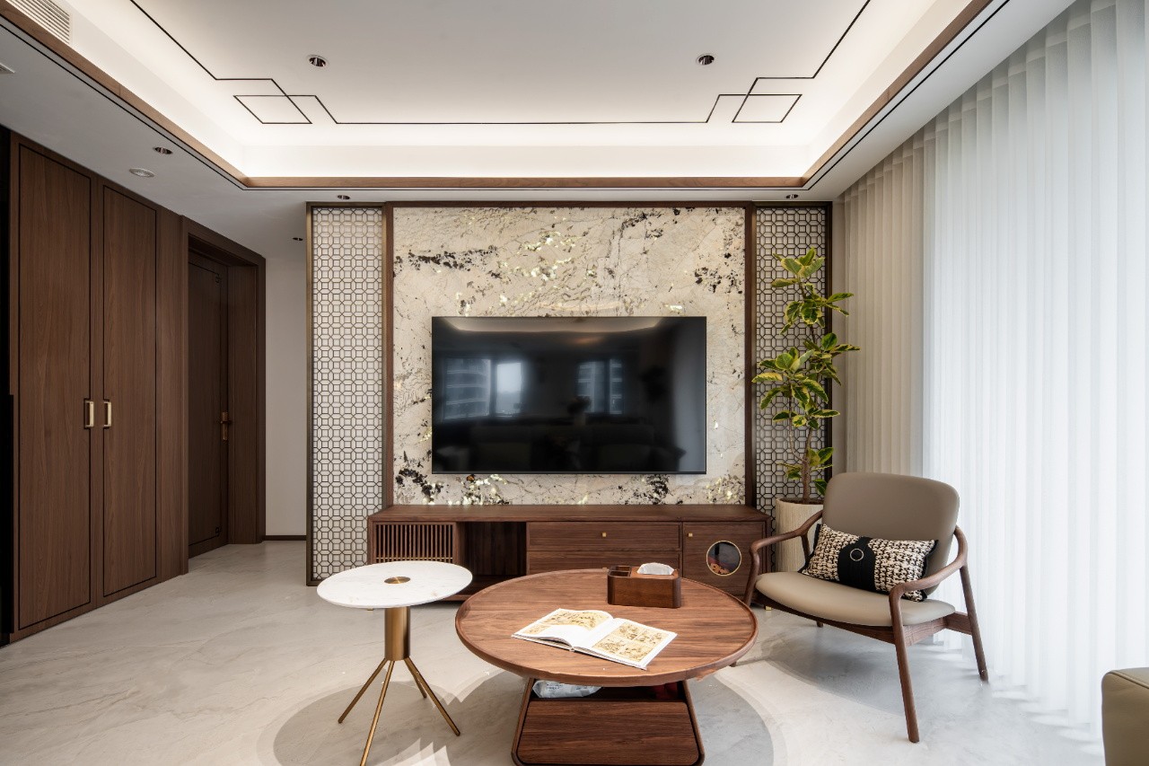 客厅以胡桃木韵为主调,没有过多繁杂装饰,只是通过木质家具、简约线条、东方美学细节,营造出宁静雅致的氛围。