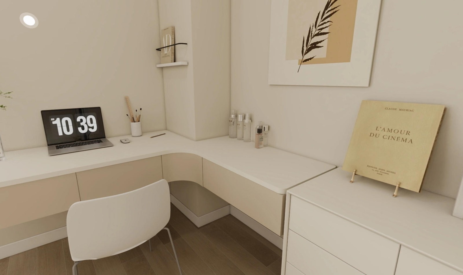 现代简约风格,以浅米色为主色调,L 型书桌设计规整实用。桌面配备电脑、文具,满足办公需求;旁侧开放格与装饰画、书籍搭配,兼具收纳与装饰功能,整体布局紧凑。