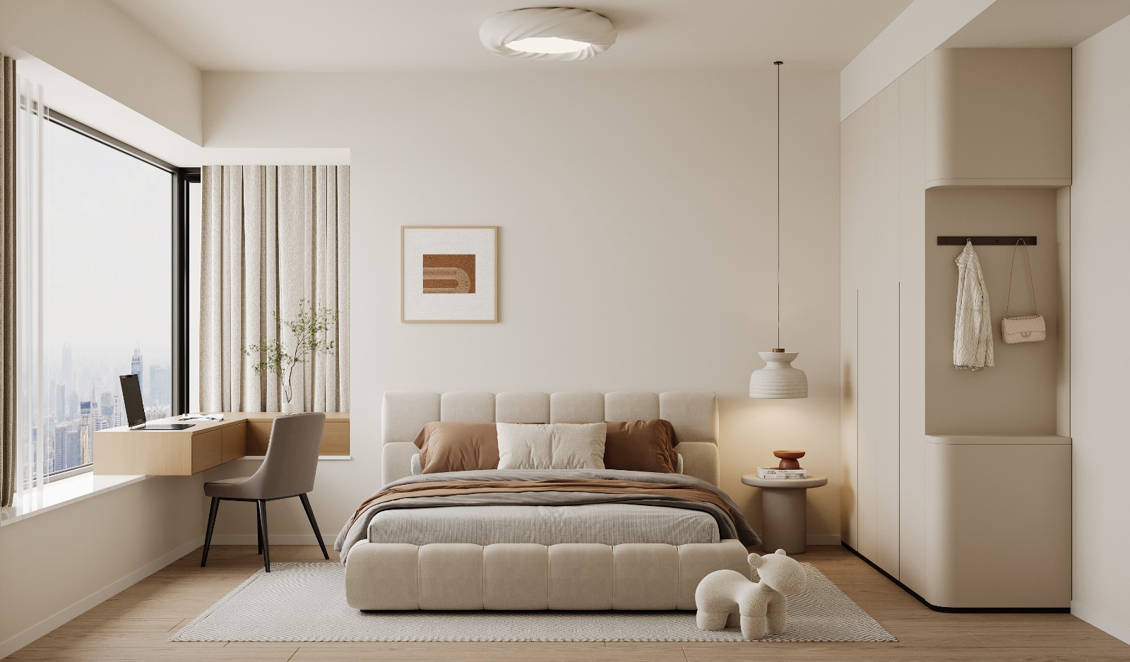 浅米色与木质元素融合,营造温馨静谧的休憩氛围。浅米色大床柔软舒适,床品的棕色与灰色搭配提升质感;窗边悬浮书桌设计巧妙,可满足居家办公需求,搭配的灰色座椅简约实用;大窗纱帘保障采光,定制柜体提供充足收纳,墙上艺术画与角落绿植点缀,让空间在舒适中兼具美学价值。