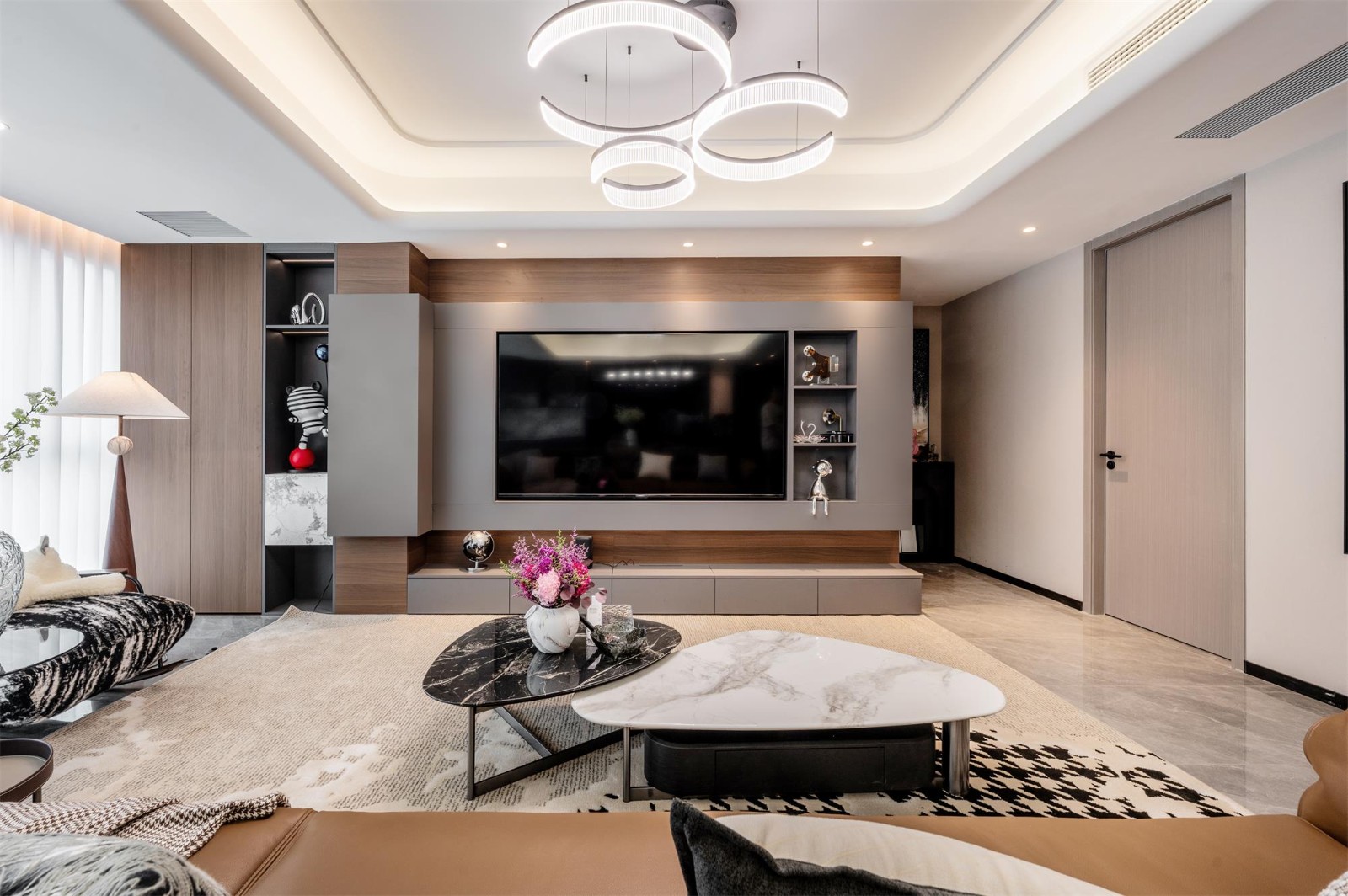 电视背景墙采用悬浮式设计结合地台,以木板上墙为基础,覆以灰色石材构成悬挑造型。材质与色彩的双重碰撞,在避免单调的同时,带来强烈的视觉张力。侧边衔接一体式通顶储物柜,适量开放格的设计兼顾了日常使用的便利性与视觉层次,共同以材质肌理与光影变化构筑出丰富的空间体验。