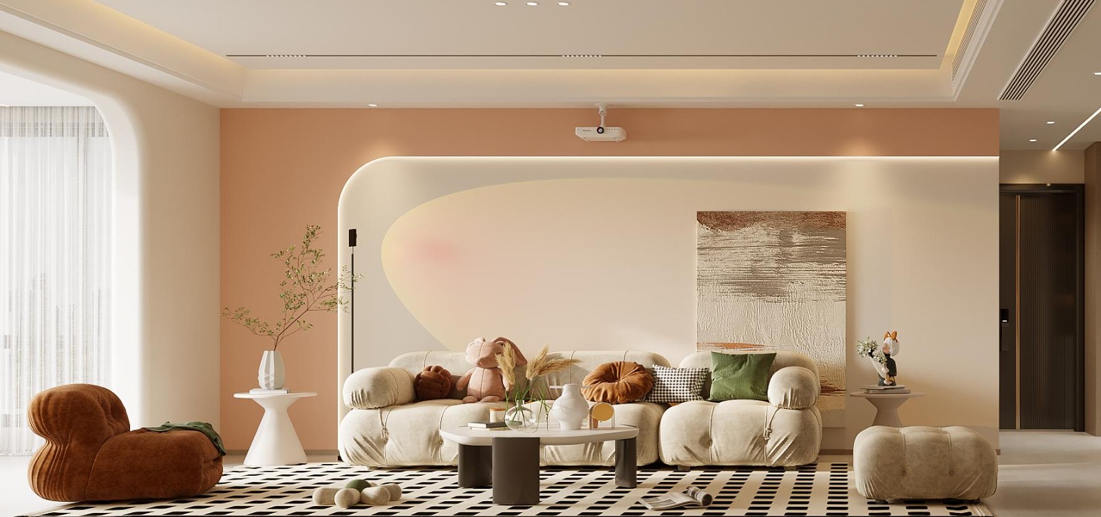 延续奶油风柔和基调,浅粉与米色墙面拼接,弧形造型自然流畅。奶油色云朵沙发搭配多彩抱枕、萌***偶,传递温馨松弛感。白色小边几、棕色单人椅与几何地毯呼应,线性灯光勾勒空间层次。