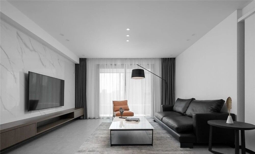 大面积的白色让客厅显得窗明几净,石材电视背景墙利用自然纹理去除白色带来的单调感,无主灯设计无形中拉高层高也让空间显得更为简约。