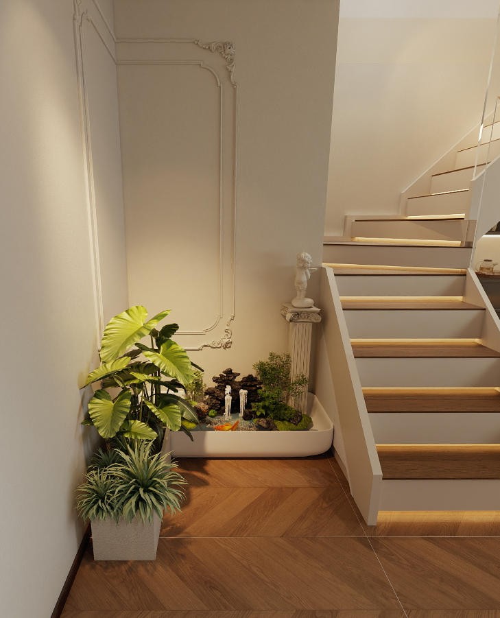 楼梯一角,也是入户进门空余的左边,放柜子生硬,放玄关也奇怪,***做成鱼缸景观,进门心情放松舒宜