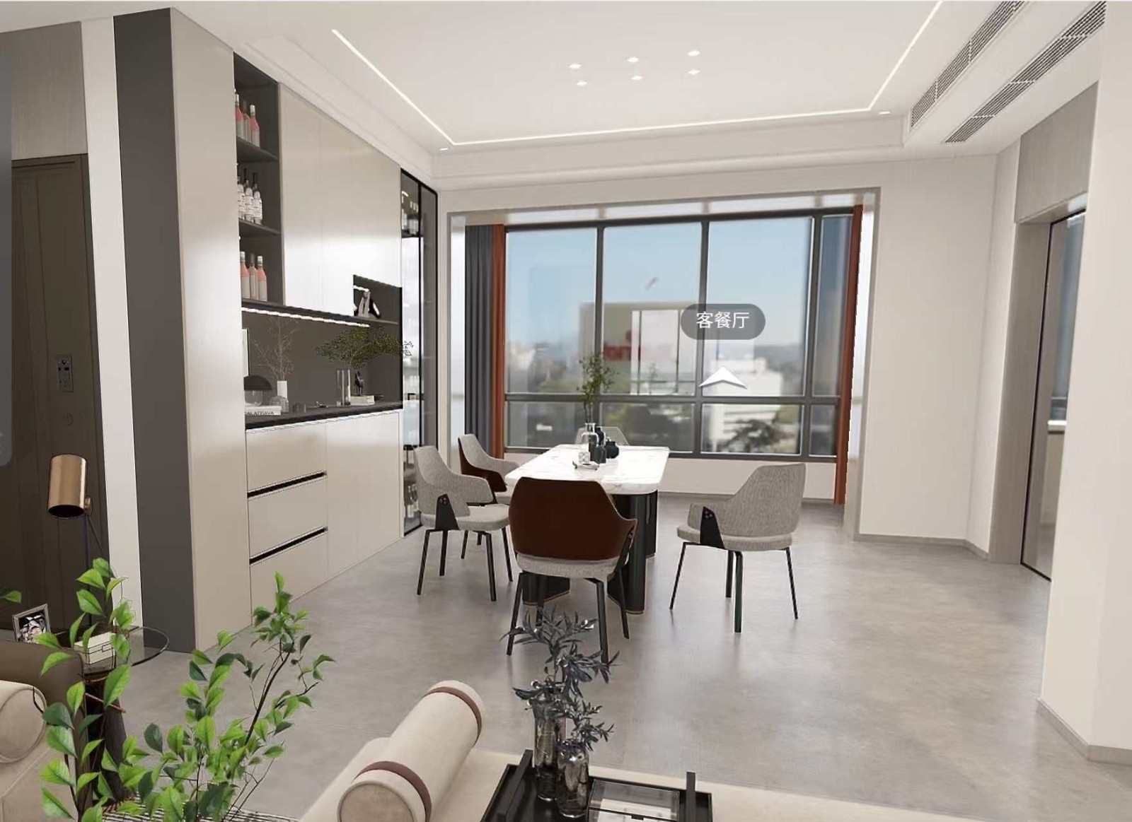 餐厅的一组酒柜增加餐厅的收纳,落地的玻璃窗,使空间变得更大,空间感更强