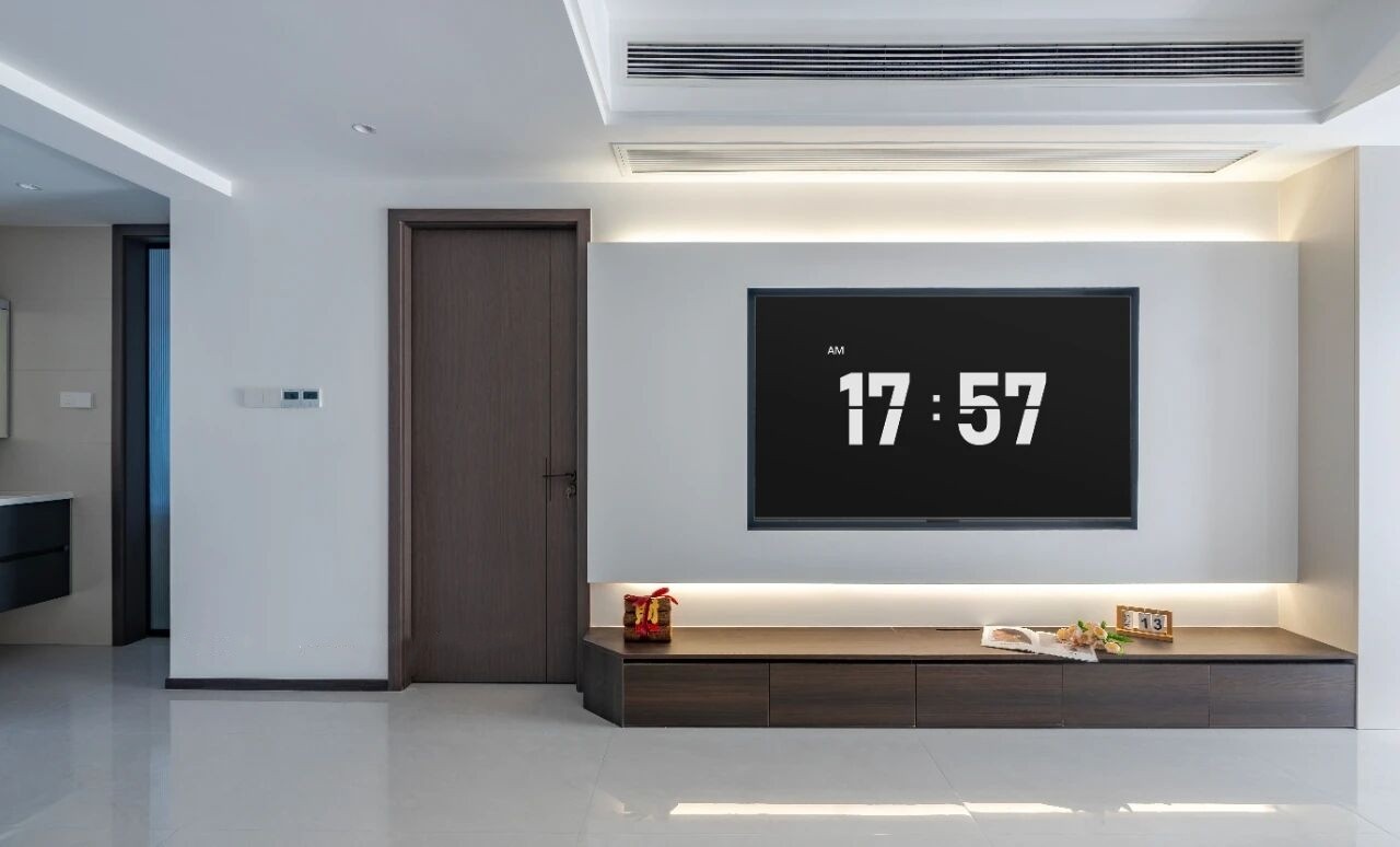 悬浮石膏嵌入式电视设计,让墙面线条更显整洁利落,契合业主对家居 “少积灰、好打理” 的洁净需求。