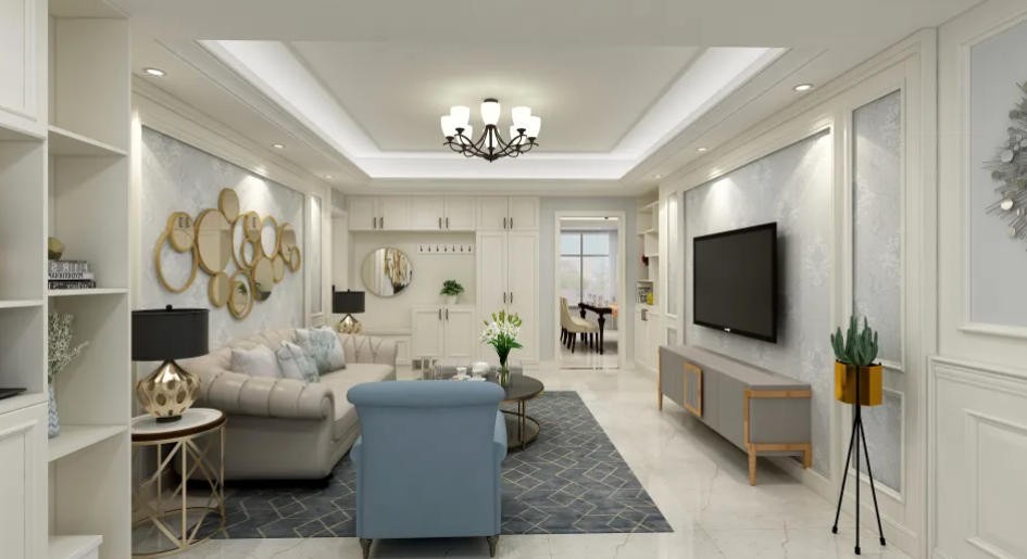 米白色沙发组合配蓝色单人椅,几何图案地毯铺陈,圆形金属装饰挂墙,电视墙简约设计,整体明亮宽敞显大气。