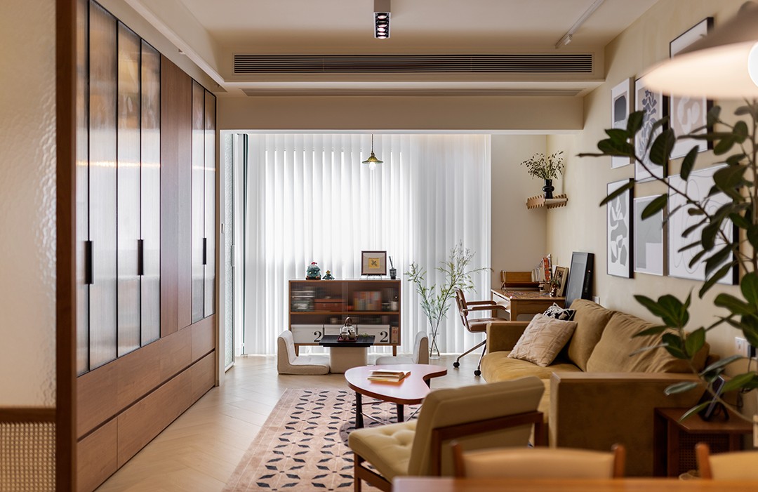 客厅不以电视墙为中心,做了一面到顶的胡桃木色书柜,搭配长虹玻璃柜门给木质书柜增添轻盈感。