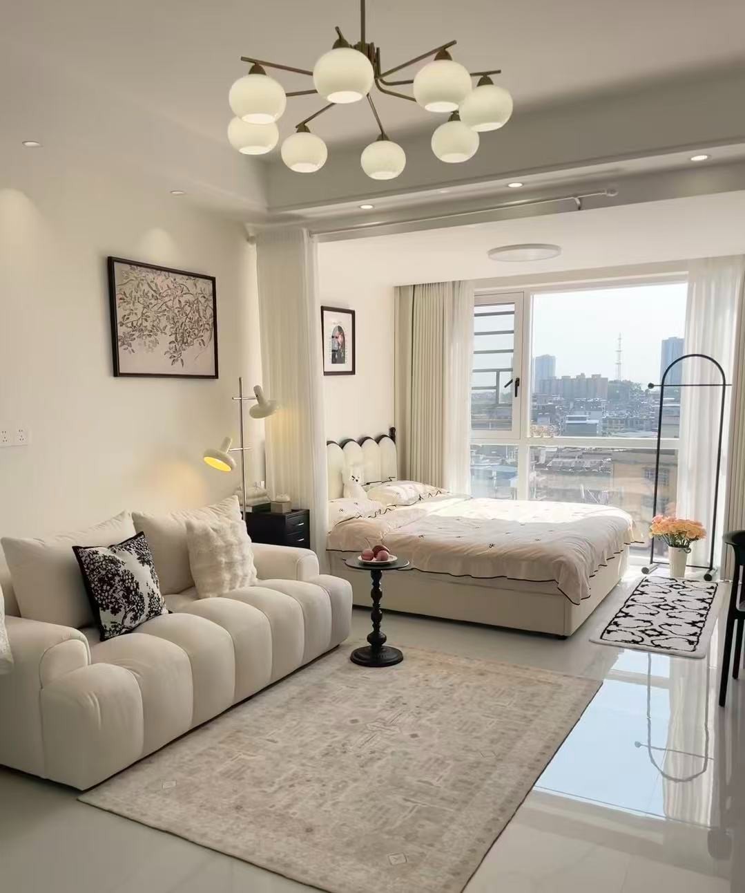 白色软包沙发+黑白花纹抱枕,质感柔软裹人;白纱窗帘让光线变得柔和,无主灯+落地灯的组合,傍晚开灯后氛围温馨又松弛;小边几、植物、装饰画这些小物件,让小空间也透着生活精致感。