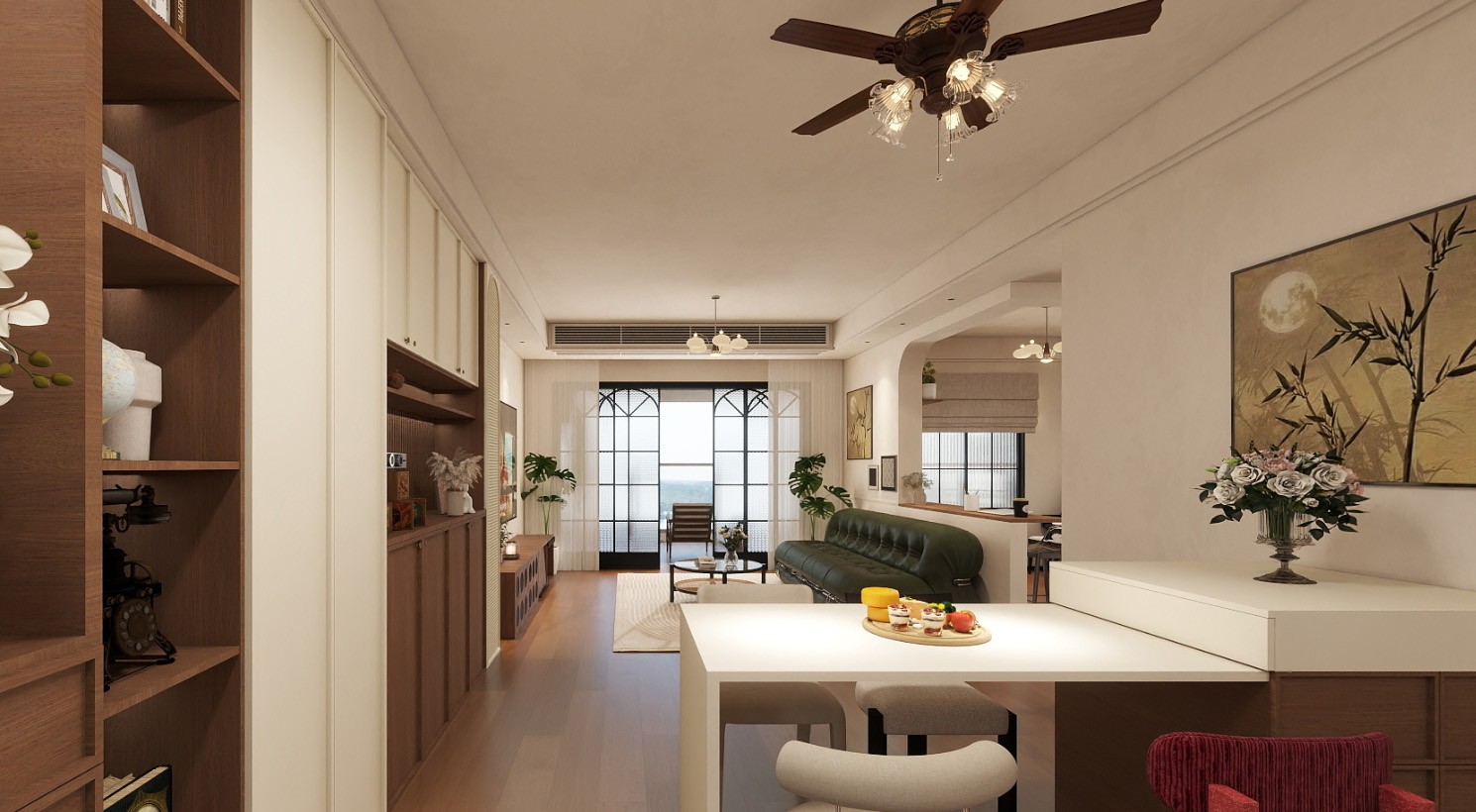 客餐一体动线流畅,墨绿色皮质沙发提升质感;复古风扇灯、木质收纳柜、墙面装饰画强化复古氛围,绿植点缀让空间更鲜活