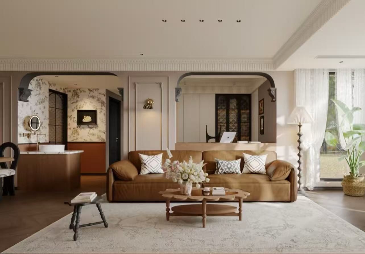 暖棕皮质沙发+复古雕花壁炉+热带元素装饰,把复古精致和度假松弛感揉得恰到好处;弧形门洞、浮雕吊顶添了空间的柔美感;