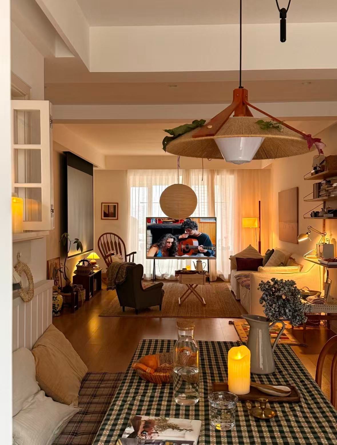 暖黄色灯光+多盏温柔灯具,把空间衬得特别慵懒舒服,是“窝着不想动”的放松感;