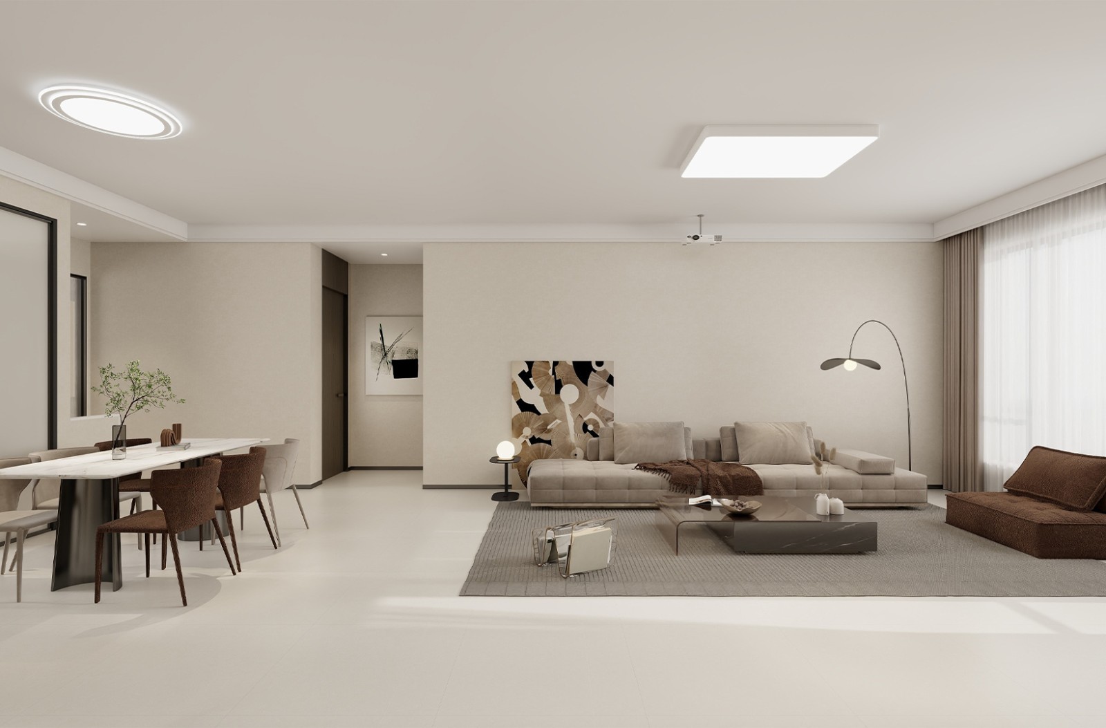 以入户视角,沙发组与餐桌分明,有着良好的动线规划。灯光以吸顶灯为主光源,点亮整个空间