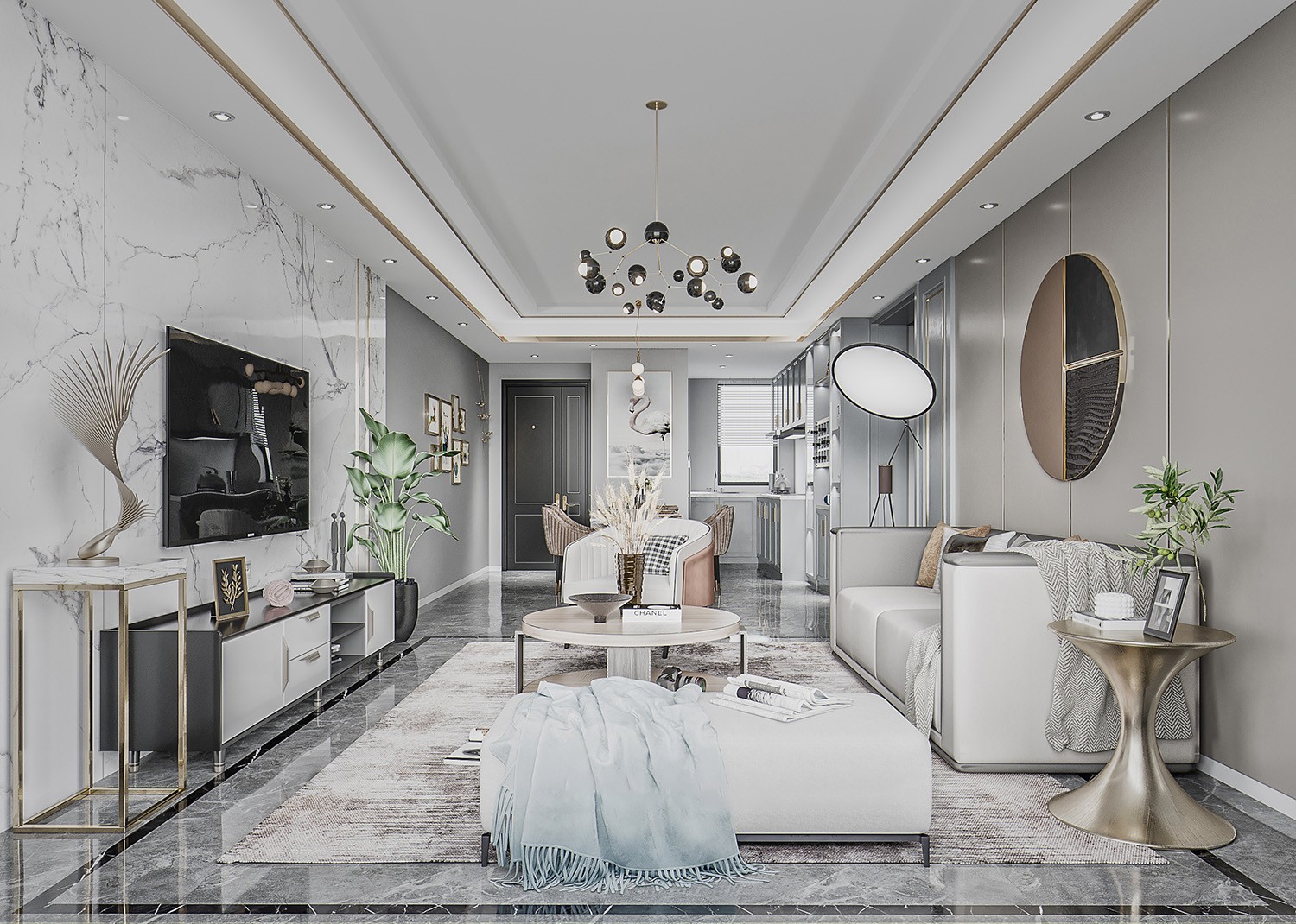 现代轻奢风格的全景呈现,大理石电视墙搭配金属线条强化质感,独特吊灯设计吸睛;空间通透开阔,软装层次丰富,是家庭互动、社交休闲的核心场所,材质与色调的搭配尽显奢华雅致。
