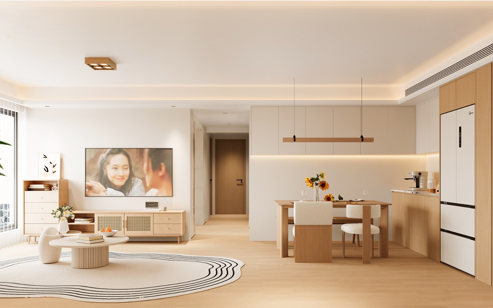 采用开放式布局,将客、餐、厨区域连通,打破空间界限,让视觉更通透,同时优化了家人活动与互动的动线,提升空间使用效率。