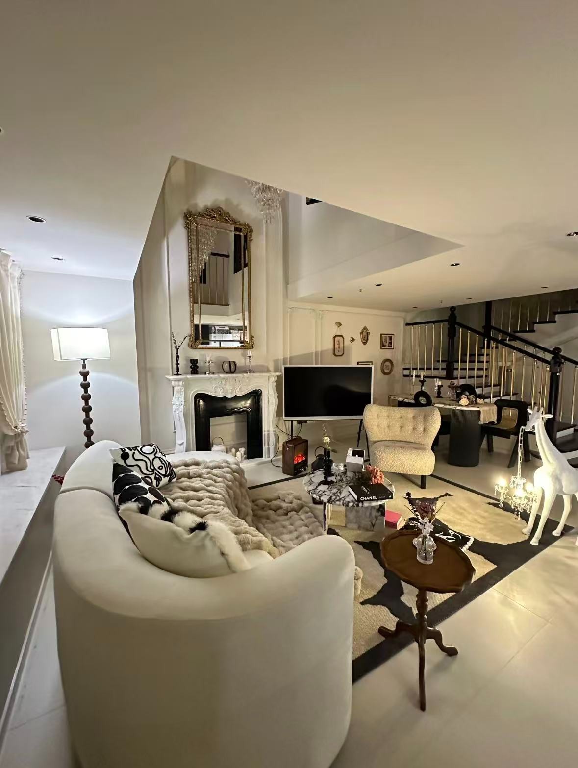 ***造型的装饰灯、壁炉旁的仿真火焰装置,还有墙面的复古小摆件,让华丽空间里多了灵动的生活趣味,精致又不刻板。