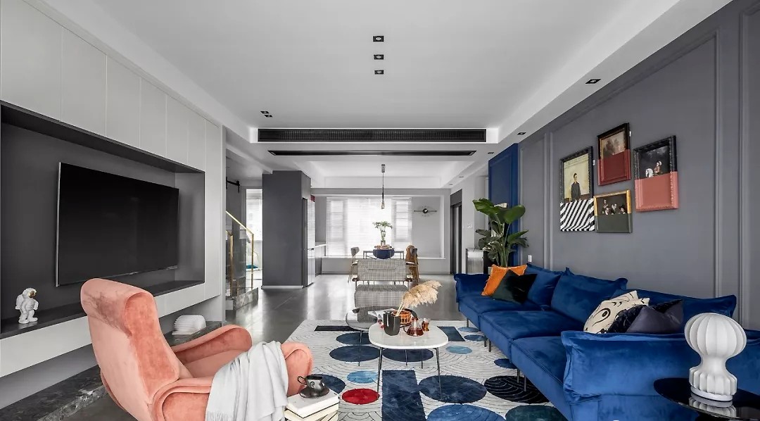 沙发背景墙以白鲸灰做底色,更好凸显沙发色质。为了色彩延续和呼应,墙面小尺度沿用了摩洛哥蓝,柔软布艺、曲线形状茶几以及地毯图案也灵动跳跃于整个空间之中。