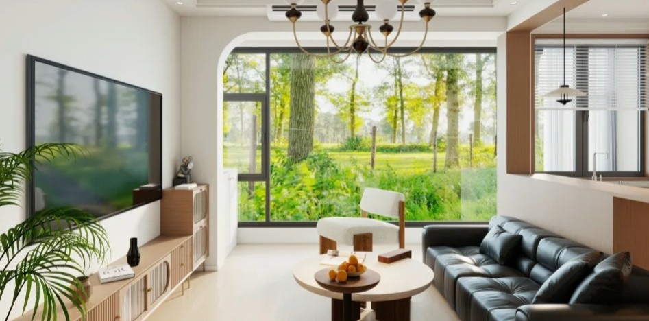 黑皮沙发搭木元素家具,拱形窗引室外绿意,金属吊灯衬质感,绿植点缀,现代简约中显松弛。