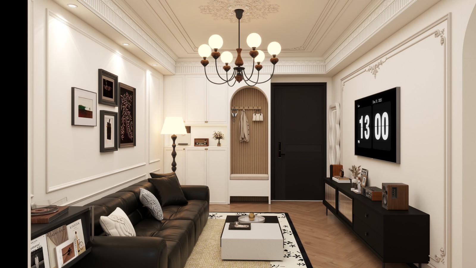 黑色皮质沙发 + 黑白花纹地毯,自带慵懒质感;石膏线墙面挂艺术画,复古吊灯 + 落地灯营造层次感,拱门玄关柜兼顾收纳与颜值。