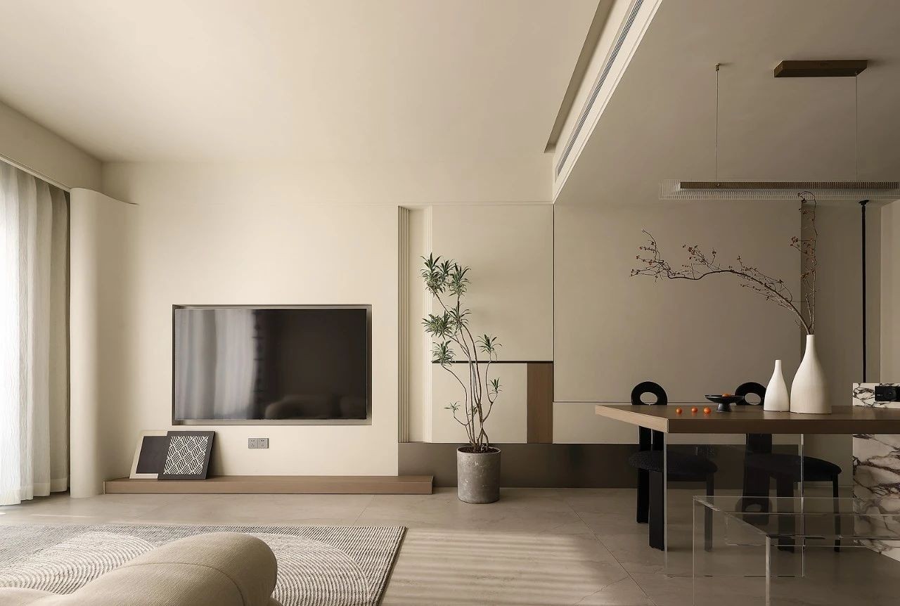 客厅区域,墙面微水泥背景延用餐厅背景序列式的排列设计手法,也称斯卡帕似的设计手法,宛如生活一切有序却惊喜的进行。