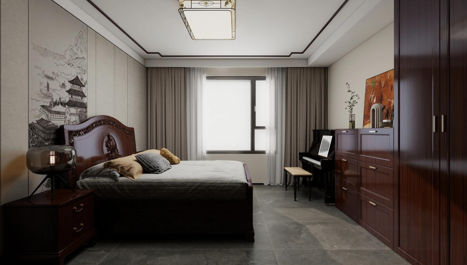 实木衣柜和钢琴把古今两个时空串联到一起,好像是从墙画中的楼里延伸出来的一个房间。
