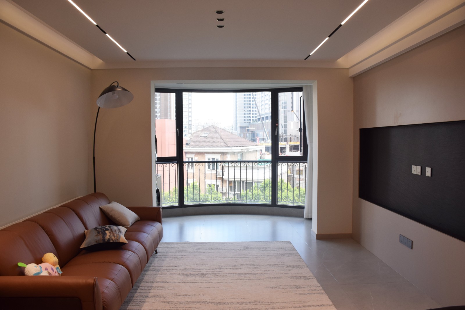 浅米色墙 + 浅灰地砖打底,焦糖皮沙发搭线性灯带,落地灯做点缀,去掉复杂吊顶,用弧形落地窗把窗外光线 “引” 进家。