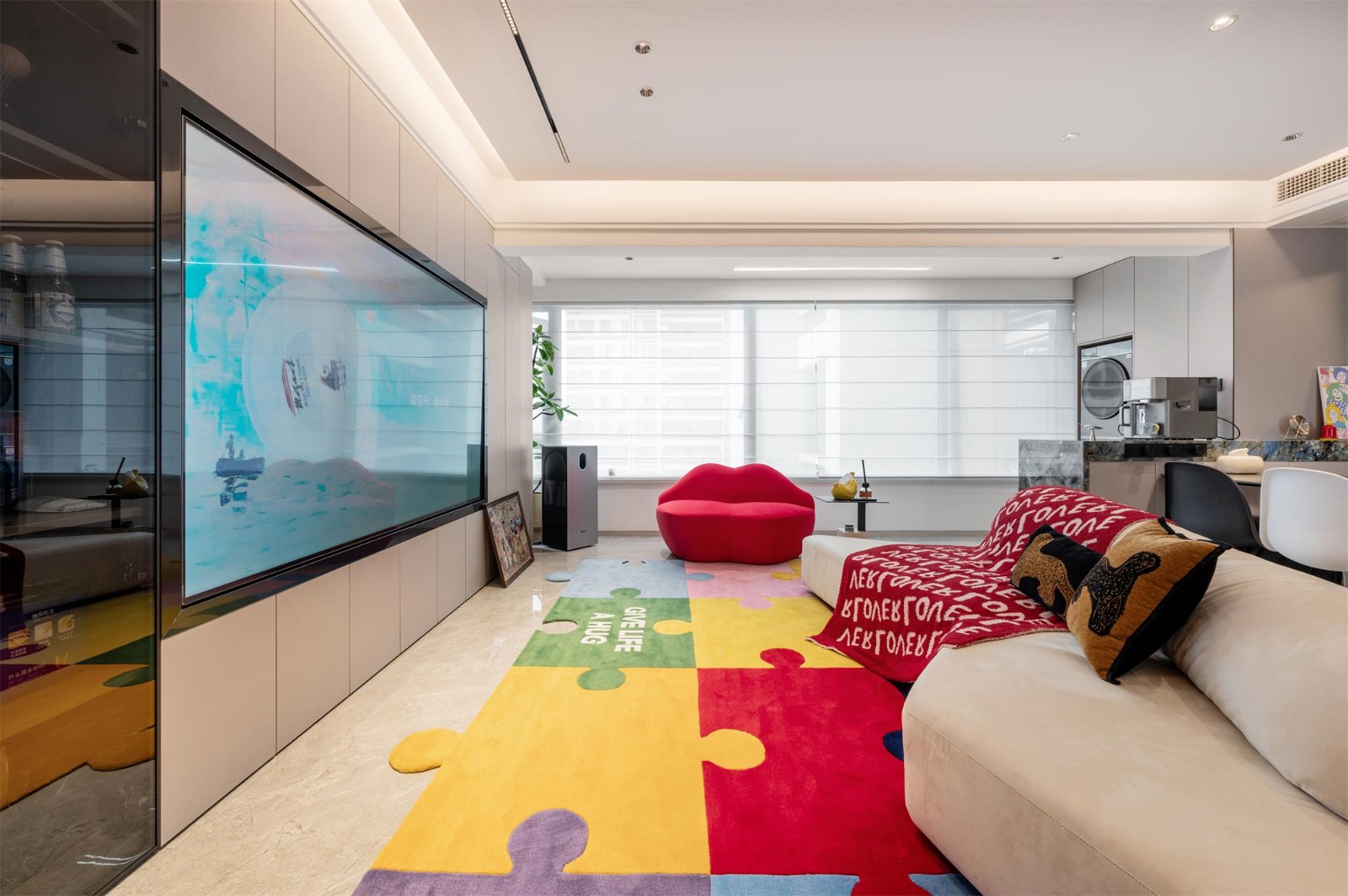 流行的异形沙发以米白色呈现,柔和地中和了空间的整体色调。再点缀上活力明亮的软装饰品,瞬间为家注入鲜活气息,让原本偏冷的氛围焕发出别样的生命力。 在高饱和度的色彩碰撞中,通过硬装与软装的巧妙调和,空间仿佛一幅跃然眼前的艺术画作,展现出只属于此处的独特美感。