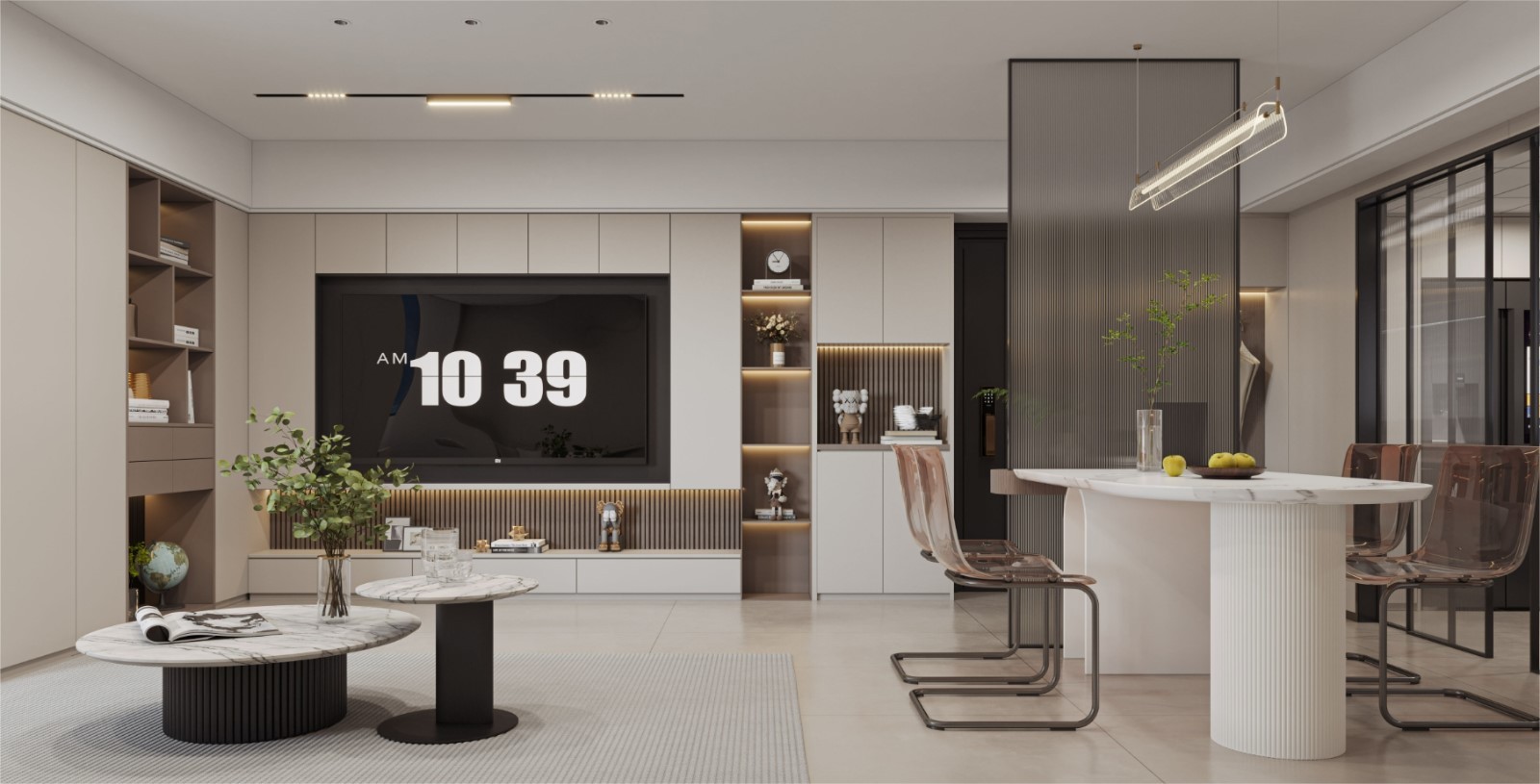 业主平时书籍比较多,需要大量的书柜,所以我电视背景采用了电视内嵌柜子的设计手法,增加了储物功能。原格局入户没有门厅,入户门分割了客厅图的整体性和互动性,所以入户做了屏风,增加了入户的门厅,使餐厅和客厅一体,产生了整体性和互动性。