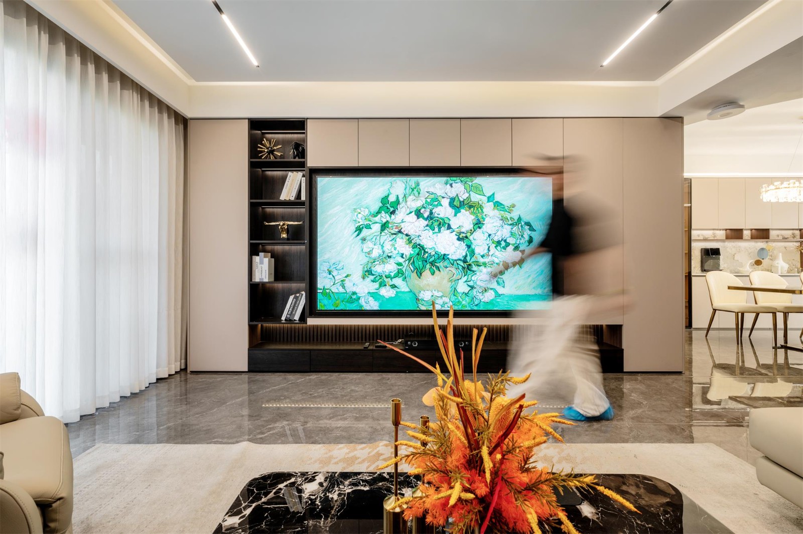 与沙发墙的“艺术感”相呼应,电视背景墙则强调“功能与美学的平衡”。整面墙以悬浮式储物柜的形式呈现,集收纳、展示与视觉主体于一体,兼顾实用与审美。